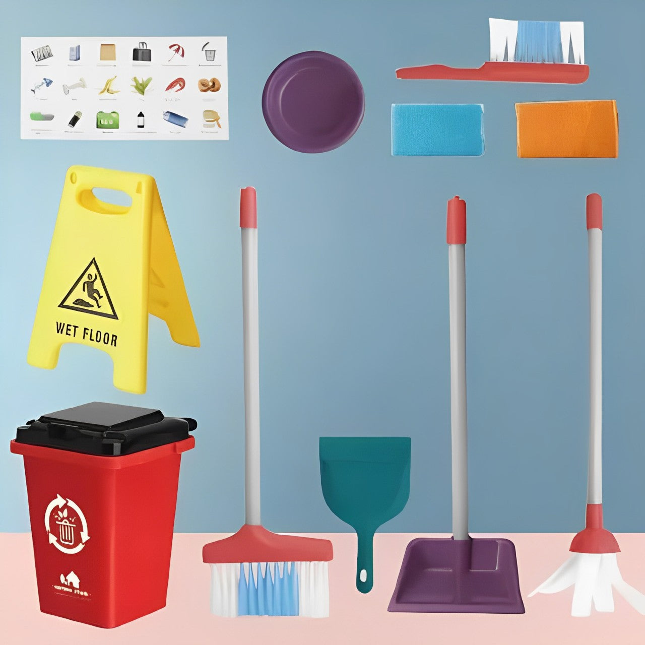 - Let your little one learn the fun of cleaning with this Kids Cleaning Playset! Designed for children aged 3 and up, this set includes a mini broom, mop, dustpan, bucket, and more to inspire imaginative play.
